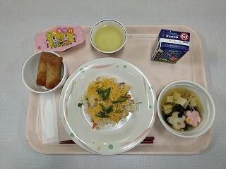 ちらし寿司・春巻き・すまし汁(花麩)・ひな祭りゼリー・牛乳