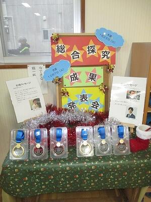 給食室に、「総合探究成果発表会」の成績優秀者に授与されるメダルが並べられました。「金」・「銀」・「銅」が各2個です。