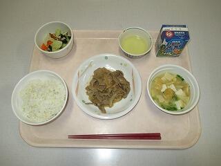 麦ご飯・牛肉のちゃんちゃん炒め・ごぼうサラダ・かき玉汁・牛乳