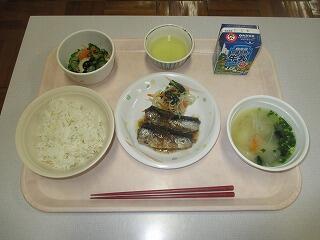 麦ご飯・イワシのおかか煮・きゅうりの甘酢和え・里芋の味噌汁・牛乳