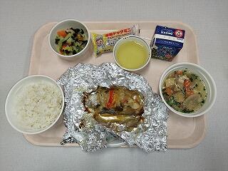 麦ご飯・魚の味噌マヨ焼き・キャベツの甘酢和え・地頭鶏汁・チョコワッフル・牛乳