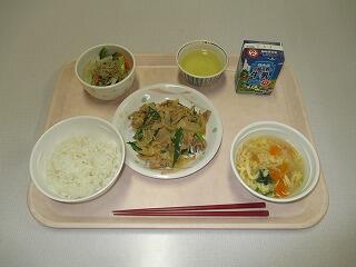 麦ご飯・豚のチリソース炒め・マカロニサラダ・コンソメスープ・牛乳