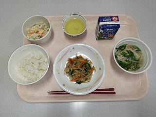 麦ご飯・豚キムチ・ごまじゃこサラダ・たまごスープ・牛乳
