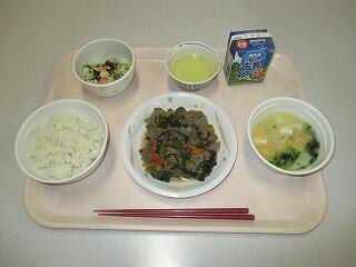 麦ご飯・牛肉のピリ辛炒め・和風サラダ・たけのこの味噌汁・牛乳