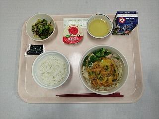 麦ご飯・鶏のBBQソース焼き・レモン風味和え・ABCスープ・牛乳