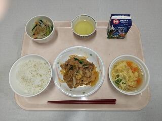 麦ご飯・牛肉のちゃんちゃん炒め・ごぼうサラダ・すまし汁(うずら)・牛乳
