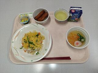 麦ご飯・ポークチャップ・チーズサラダ・コンソメスープ・牛乳