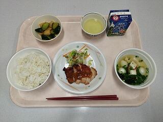 麦ご飯・鶏のBBQソース焼き・レモン風味和え・ABCスープ・牛乳