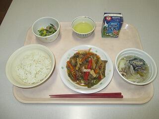 麦ご飯・豚肉の生姜焼き・キャベツの甘酢和え・竹の子の味噌汁・牛乳