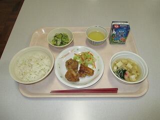 麦ご飯・鶏の唐揚げ・おかか和え・すまし汁(花麩)・牛乳