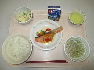 麦ご飯・鮭のレモンマリネ(給食初メニュー)・ポテトサラダ・きのこのコンソメスープ・牛乳