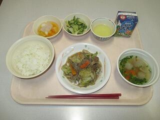 麦ご飯・牛肉のちゃんちゃん炒め・おかか和え・つみれ汁・フルーツ白玉・牛乳