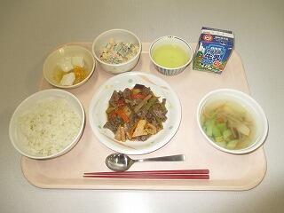 麦ご飯・チンジャオロース・マセドアンサラダ・もやしの中華スープ・杏仁豆腐・牛乳