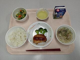 麦ご飯・鶏のBBQソース焼き・レモン風味和え・きのこコンソメスープ・牛乳