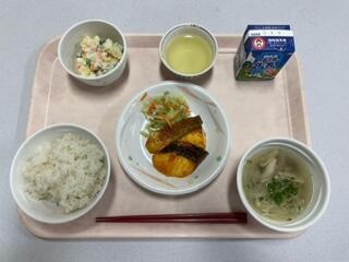 麦ご飯、魚のオーロラソース焼き、マセドアンサラダ、きのこスープ