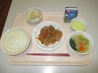 麦ご飯・ポークチャップ・マカロニサラダ・白菜スープ・牛乳