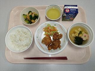 麦ご飯・鶏の唐揚げ・ピリ辛漬け・すまし汁(花麩)