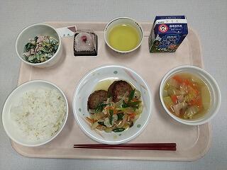 麦ご飯・和風ハンバーグ・ビーンズサラダ・白菜スープ・祝い菓子