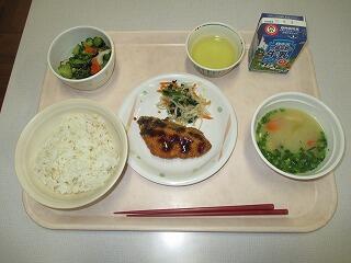 麦ご飯・カンパチフライ・きゅうりの甘酢和え・玉ねぎの味噌汁・牛乳