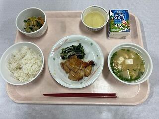 麦ご飯・鶏の照り焼き・ピーナッツ和え・竹の子の味噌汁・牛乳