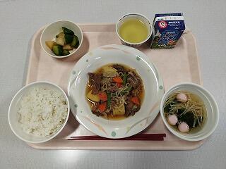 麦ご飯・肉じゃが・ピリ辛漬け・すまし汁(はんぺん)・牛乳