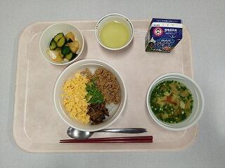 三色丼・ピリ辛漬け・すまし汁(なると)・牛乳