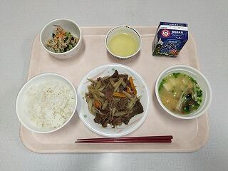 麦ご飯・牛肉のちゃんちゃん炒め・ごぼうサラダ・すまし汁(うずら)・牛乳