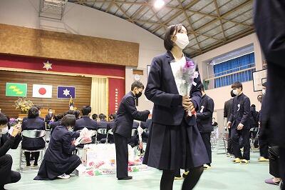 本日、令和2年度卒業式が行われました。コロナ対策により、例年より小規模での開催となりましたが、無事終えることができました。先輩方は誰もが前向きで希望に満ちた顔をしており、悔いのない高校生活を送られたことが、表情から伝わってきました。これから卒業生の皆さんは新たな学校や会社で、在校生は進級に向けてそれぞれ頑張っていきたいです。3年生の皆さん、ご卒業おめでとうございます!