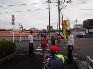 朝7時より正門付近の交差点を通行する小学生や地域の方にあいさつを行い、横断歩道では手を挙げて渡るよう、声かけを行いました。みなさん協力していただき、交通指導を終えることができました。