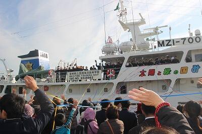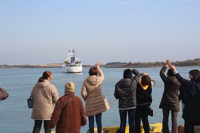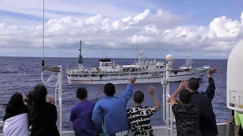 島根県の実習船、神海丸に手を振ってあいさつをしています。