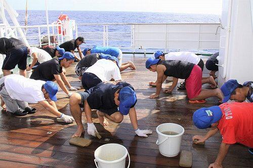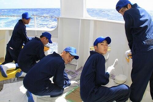復路の主な実習は船員の基本となる「船体整備作業」です。
