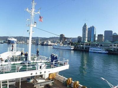 ホノルル入港の様子。アロハタワー前には他県実習船も停泊中です。