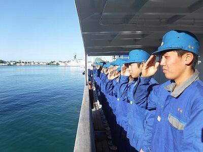 実習生は50日ぶりの陸に嬉しさ爆発といった表情で敬礼していました。