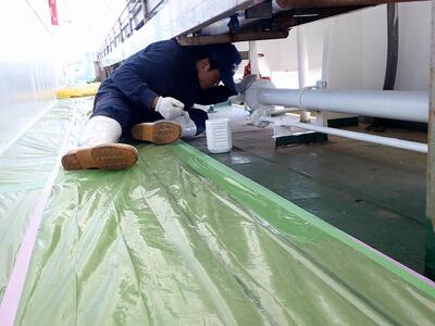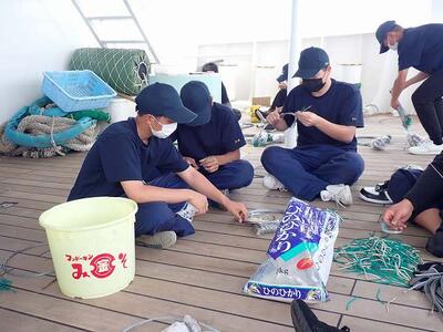 帰途につきながら、漁具の整備実習です。 船体整備実習の様子。養生をしっかり行います。