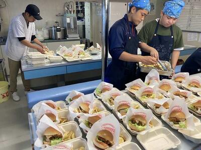 消火設備・消火ホースを実際に体験します。 本日の昼食「進洋丸プレミアムバーガー」準備中!