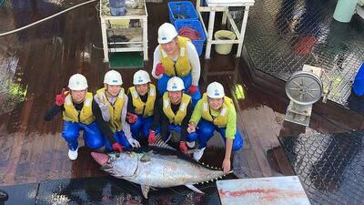が揚がりましたので、実習生は魚と一緒に記念撮影をしていました。