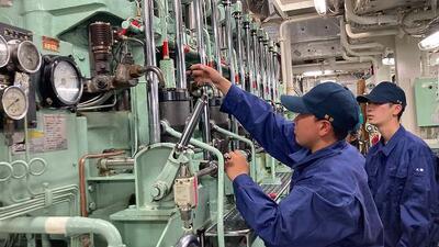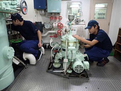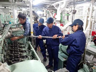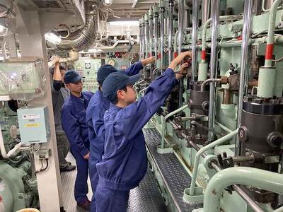 停泊中にしかできない点検・実習があります。 主機関のクランク軸、カム軸の点検中!!