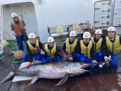 167cmの大きなメバチと一緒に記念撮影。 メバチに続いて大きなメカジキも揚がりました!
