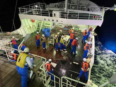 これから急速冷凍をした漁獲物を艙内へ移動します。 操業期間中の海洋観測も安全・確実に行います。