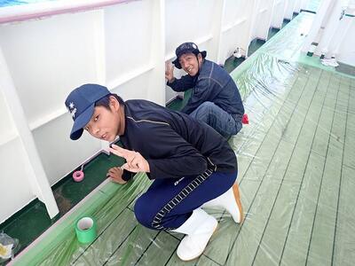 昨日離岸し、港内に投錨しています。実習生は船体整備作業の仕上げとして教官と