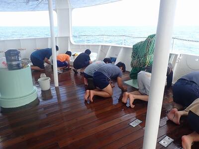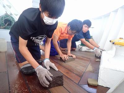 乗組員指導の下、木甲板のストーン磨り作業に汗を流しています。