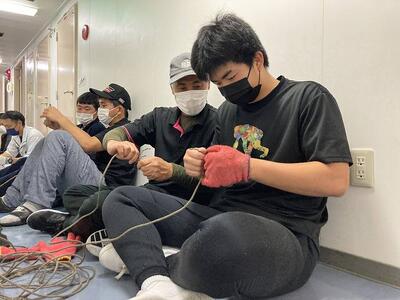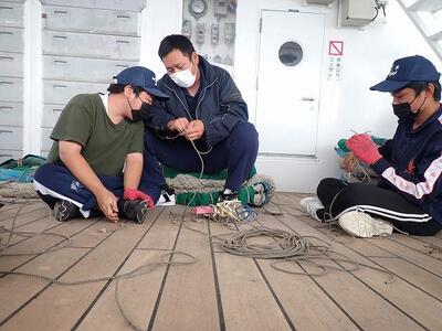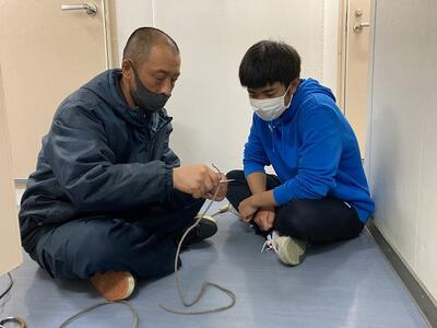 ロープを使った実技指導です。ベテラン乗組員や指導教官の先生方から手取り足取り教えてもらいます。