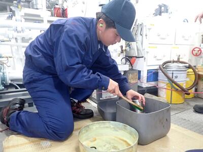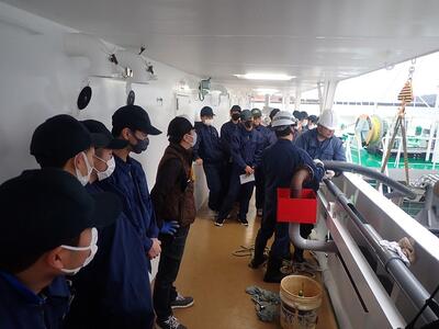 乗組員指導のもと、操業機器の準備およびメンテナンスの真っ只中です。