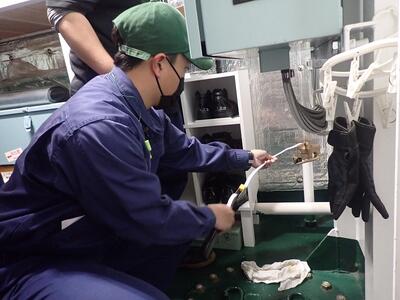 機関当直では、主機関の最高圧力計測実習を行っています。