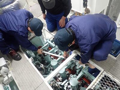 ウネリ高く、大きくピッチングする機関室で実習生は機関整備実習に取り組んでいます。