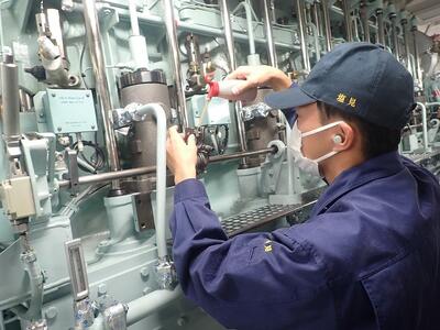 機関当直の様子です。機関室の巡視や機器の計測、機関室配置図の作成を行っています。当直作業は、発電機の燃料こし器の開放点検掃除を行いました。