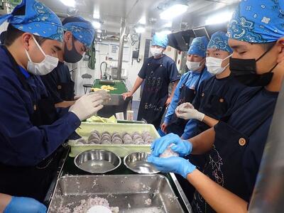 朝のラジオ体操の様子です。夕食で手巻き寿司をいただきました。実習生、全員元気に船内生活を過ごしています。