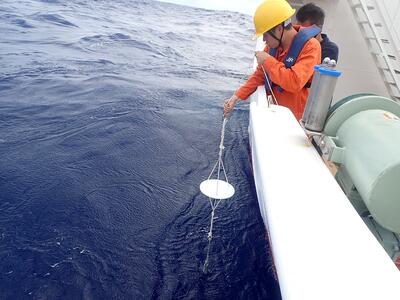 海洋観測も始まりました。CTD(観測装置)により、水深1000mの水温と塩分を調査します。また、透明度板を海中に沈めていき、目視で確認できる深さを海水の透明度として計測します。太平洋のど真ん中はとてつもなく海が綺麗です。本日の透明度は37mでした。