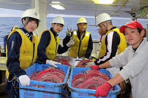 実習生は初めての作業に戸惑いながら、乗組員の指導を受け真剣な表情で