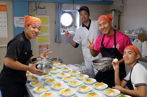 今日の昼食は実習生待望のメバチ鮪食育メニュー。「やばいレベル」の脂の乗りに